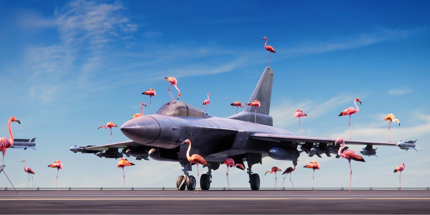 The flamingo interferes with an aircraft carrier. To keep the runway clear and get the planes to take off, the military have to get rid of the bird. But the flamingo and its congeners keep returning back relentlessly in order to colour the grey war machine pink. The pink sky lies above us.