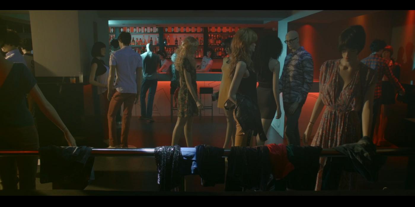 Vairāki manekeni izkāpj no skatlogiem. Vizuāla eseja par cilvēku (ne)laimi.